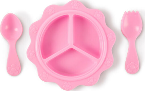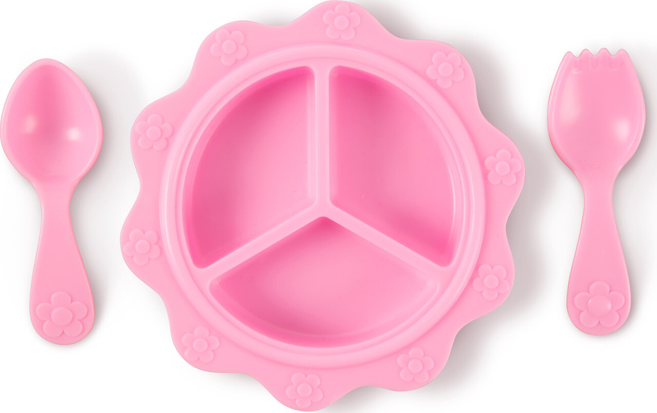 Every mommy knows how important it is to feed a little baby. Now, your little mommy can take care of her baby with this adorable 8-piece set. An easy-close, embroidered bib, keeps baby clean during mealtime which is organized with a divided dish, fork, spoon and yummy “applesauce” and “peas and carrots” for the baby. Disappearing “orange juice” and “milk” bottles add nutrition and fun!