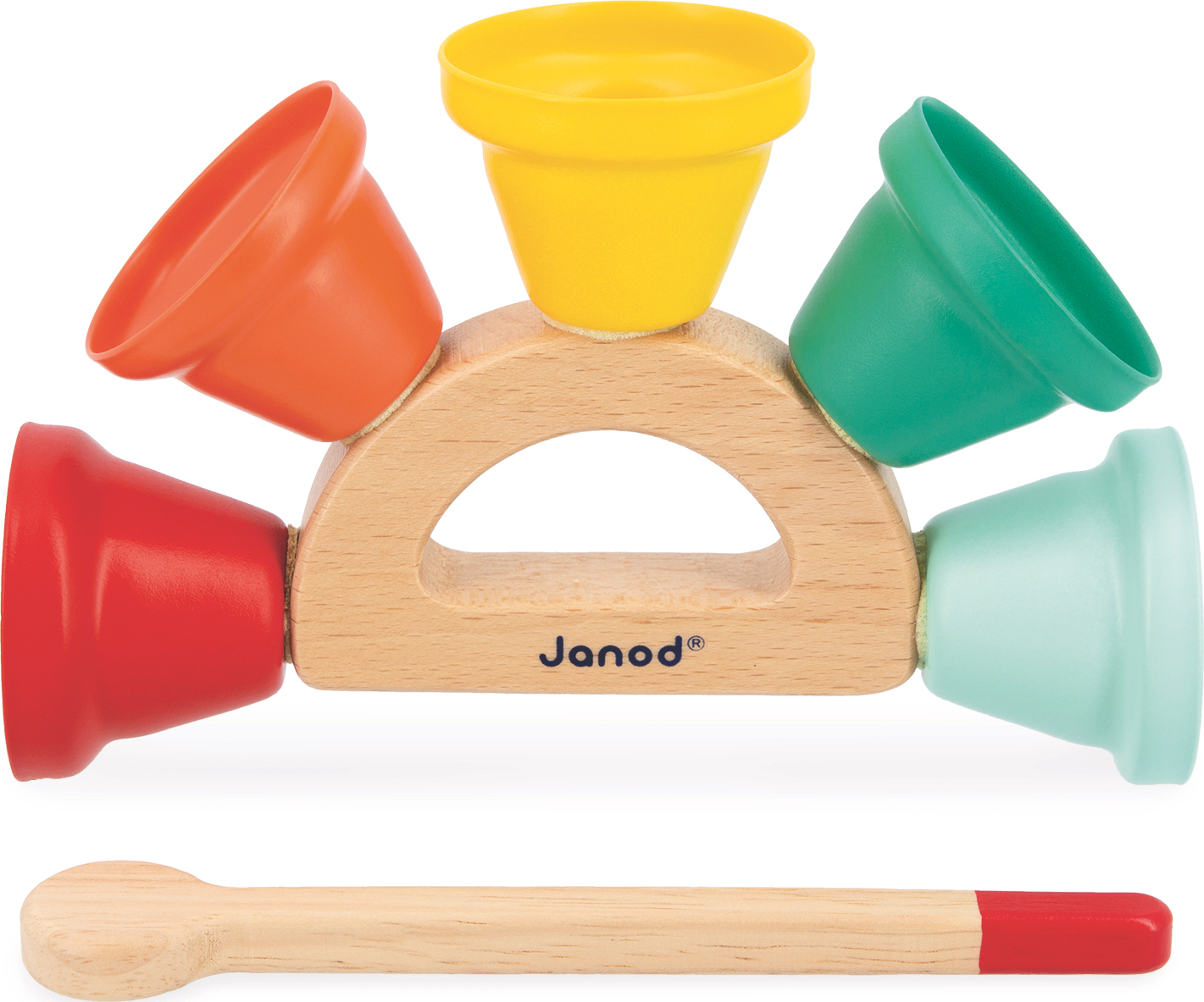 What 5 notes are these? Find out with the 5 Janod bells! This children’s musical toy can easily be grasped via its chunky wooden handle.