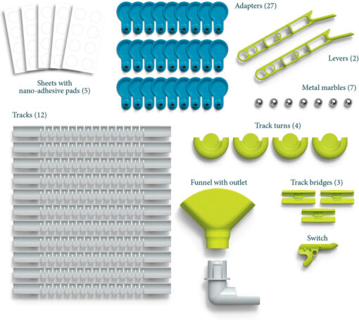 Included in TIME’s Best Inventions of 2024 list! Move over boring marble runs, there’s a new kit in town. Witness physics in action with this innovative, flexible system of tracks. Thanks to nano pads (safe little strong suction cups), any smooth vertical surface has the ability to become a marble run. Future engineers create hills and jumps, setting up trick shots and learning through trial and error. We love that it’s intuitive, mess-free, open-ended, and educational. Includes 12 tracks, 27 adapters, 40 nano-adhesive pads, 2 levers, 7 metal marbles, 4 track turns, funnel with outlet, 3 track bridges, 1 switch, and instruction booklet.