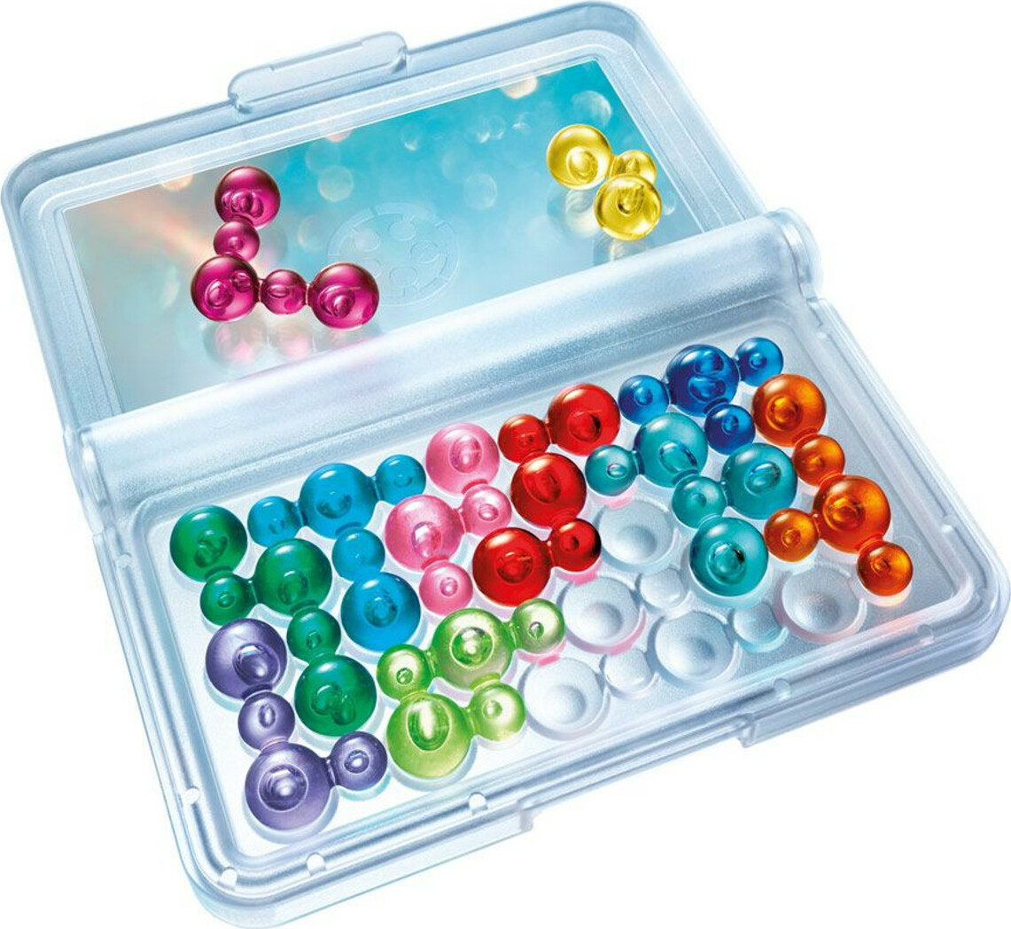Fit the bubbles… solve the puzzles! Test your brainpower with IQ Bubbles. This addictive puzzle game challenges players to fit all the colorful, transparent bubble pieces onto the travel-friendly gameboard./case. With 120 challenges to solve – from Starter to Wizard level – IQ Bubbles is great for kids and adults!