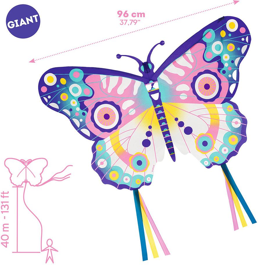 From DJECO – Kids’ faces light up with wonder and joy as this giant butterfly kite floats in the breeze! From Djeco, for ages 5+ yrs.