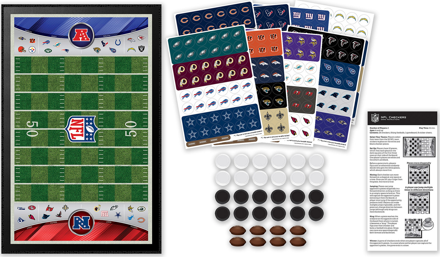 - Game includes 24 checkers pieces, 8 football king pieces, 13 inch x 20.5 inch game board, sticker sheet and instruction sheet