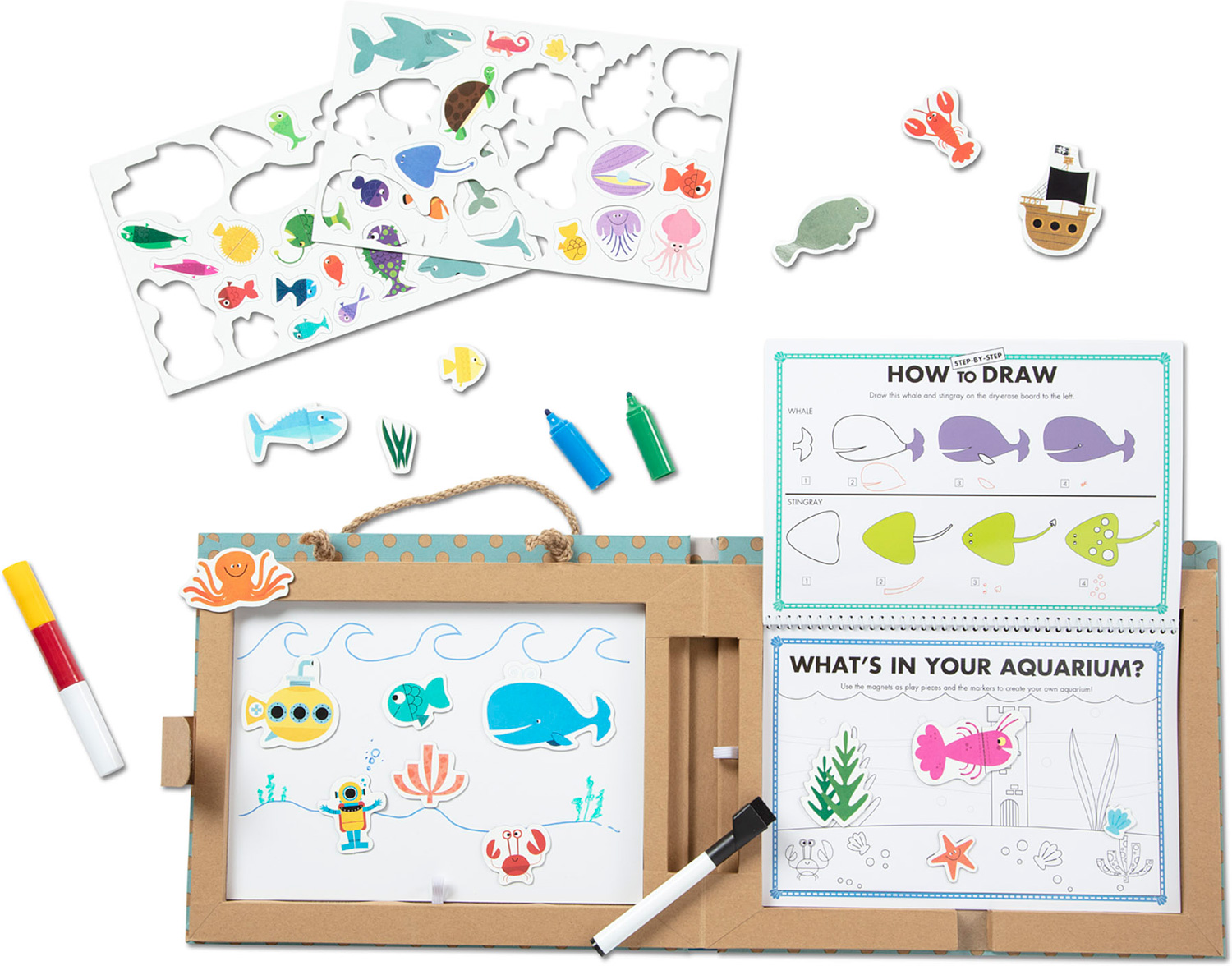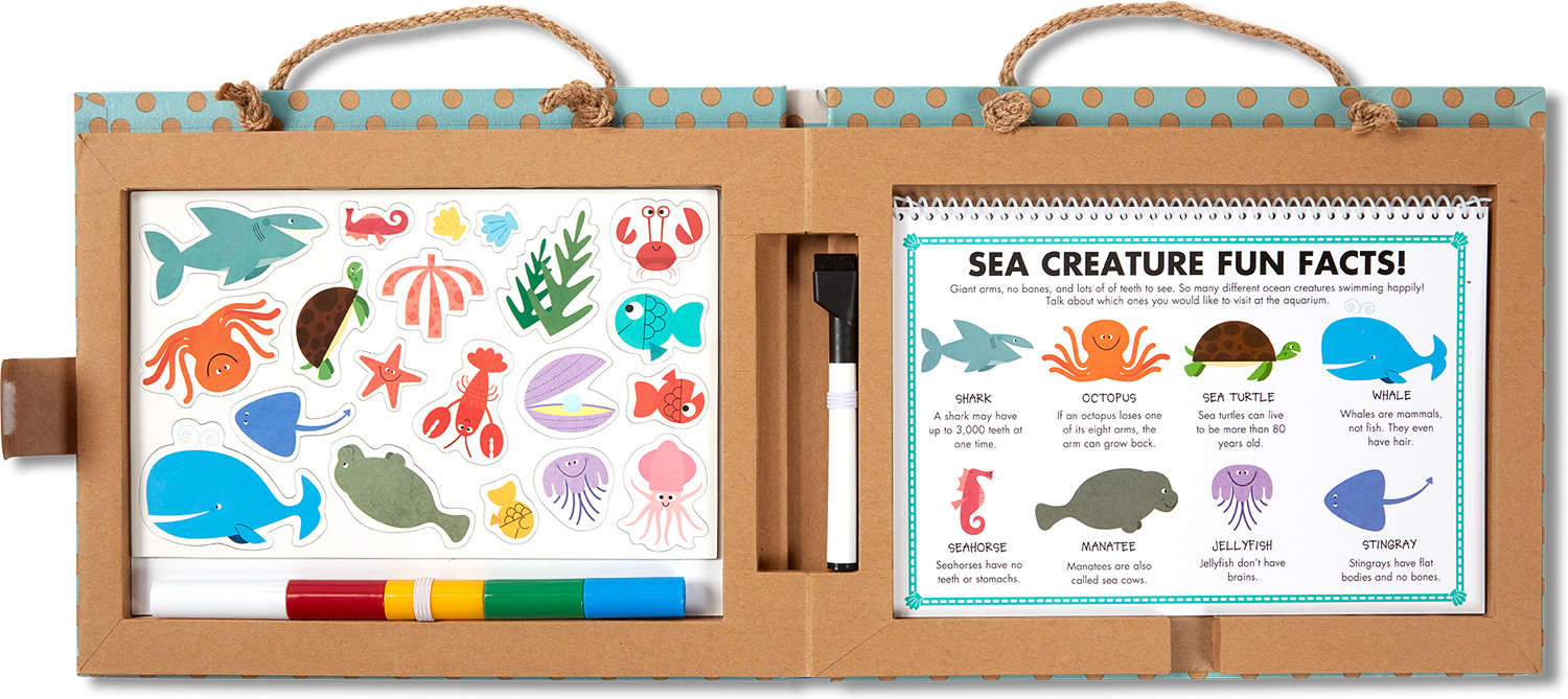 FeaturesNatural Play ocean-themed Play, Draw, Create reusable drawing and magnet activity kit Includes 42 magnets, 5 dry-erase markers with an eraser, built-in magnetic dry erase board, 13-page spiral-bound dry-erase activity book Makes a great gift for preschoolers to school-age kids, ages 3 to 8, for hands-on, screen-free play