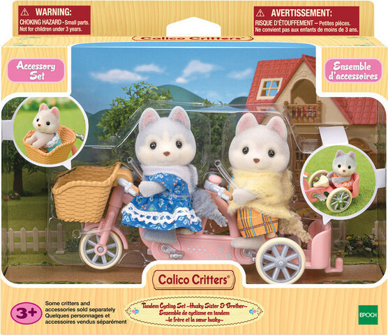 Calico Critters miniature dollhouses, playsets and figures are timeless and classic high-quality toys. This ready to play set includes 2 poseable figures in removeable clothing, along with tandem bicycle with rotating wheels, basket and pull cart for husky twins. Husky brother and sister Hayden and Pauline love to ride their bike through Calico Village! Pauline is full of energy and loves to go as fast as she can, but Hayden prefers to go slower so that he can see all the beautiful flowers and unusual trees along the way. What do you think they’ll see today?