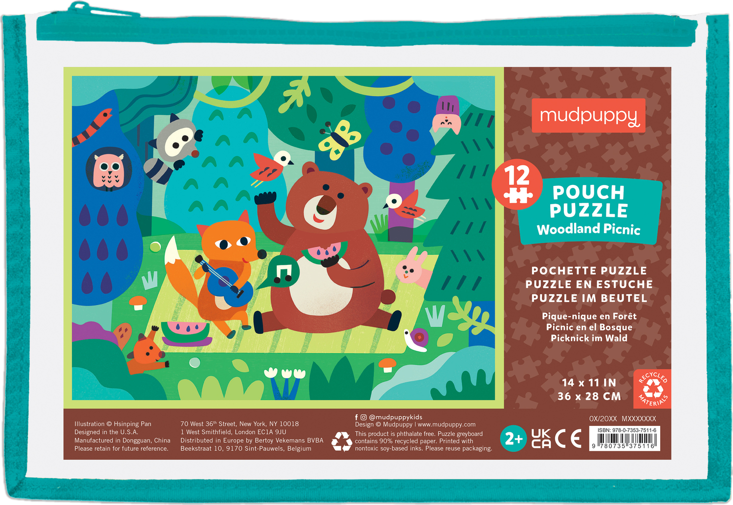 Join your favorite woodland friends for a fun and exciting picnic! Mudpuppy’s Woodland Picnic Pouch Puzzle features 12 extra-thick pieces perfect for small hands. This jigsaw puzzle is packaged in a secure, reusable pouch with ribbon edging and coordinating zipper for easy storage and travel.